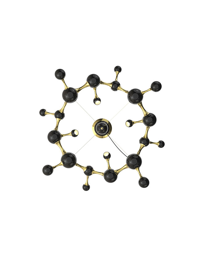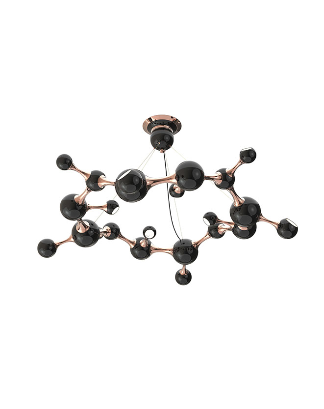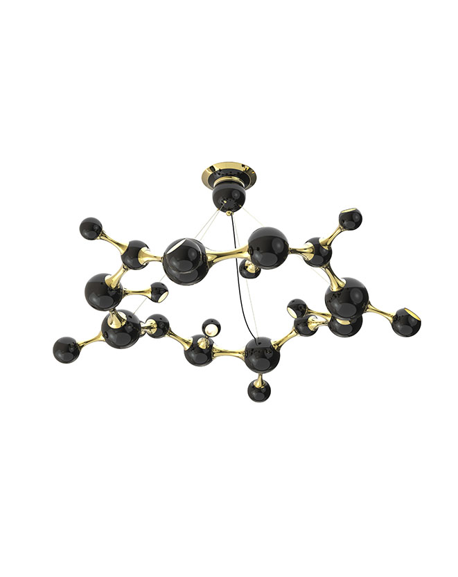 Atomic Round Suspension Lamp was inspired by the molecular composition of the atom as a nod to the atomic age and race to space mid-century era. DelightFULL’s designers created a round set of spotlights all arranged to look like the non-conventional molecular forms. This unique black chandelier is all handmade in brass and steel, with a gold-plated finish on the body and lacquered a glossy black on the round shades. The inside of the spotlights is lacquered a gold powder paint, in order to create a smoother light to the human eye. The right modern dining room lighting design, Atomic round chandelier cannot be missed. It is also suited for a more scandinavian style living room, being the perfect example of class meets fun.