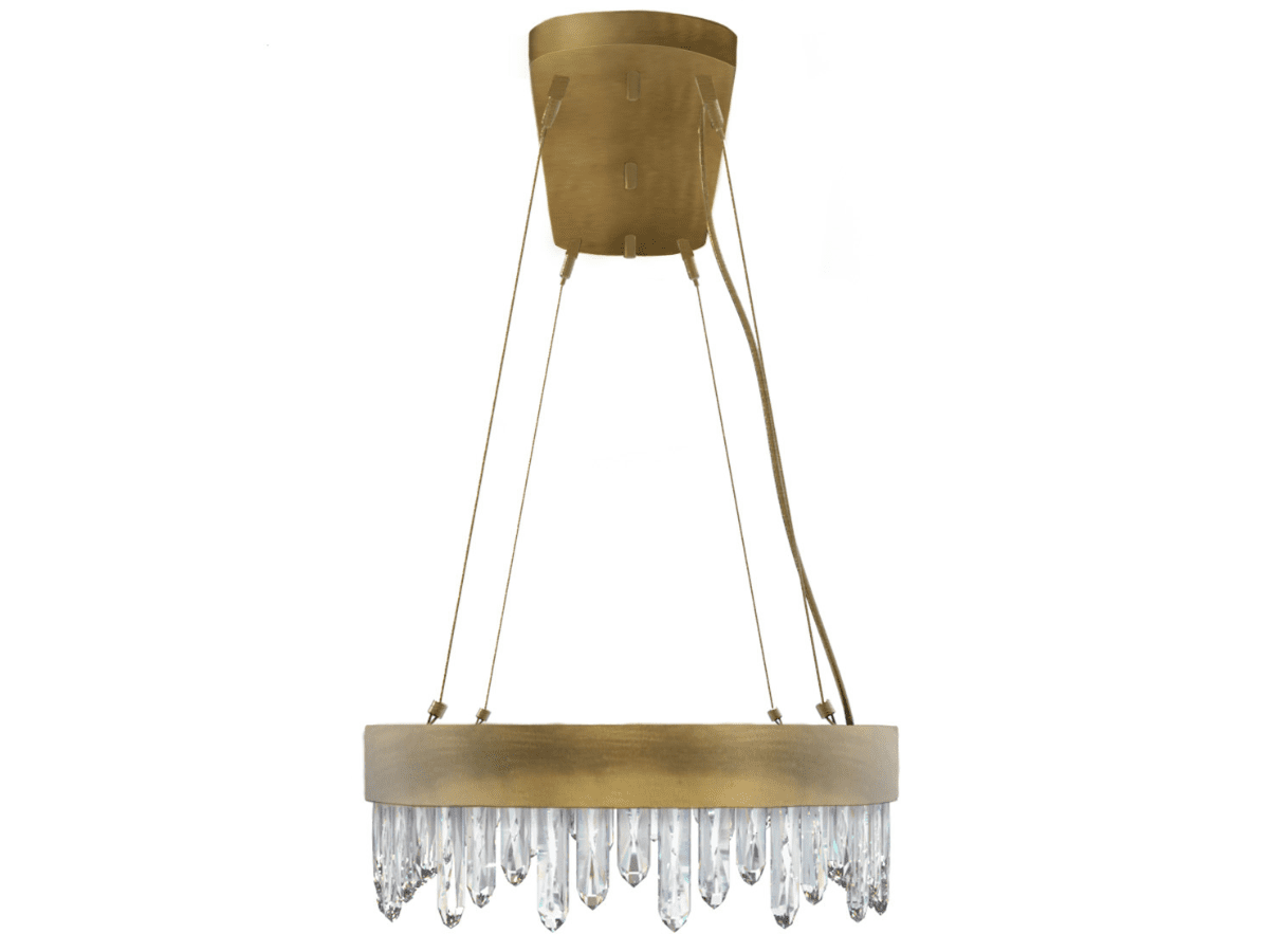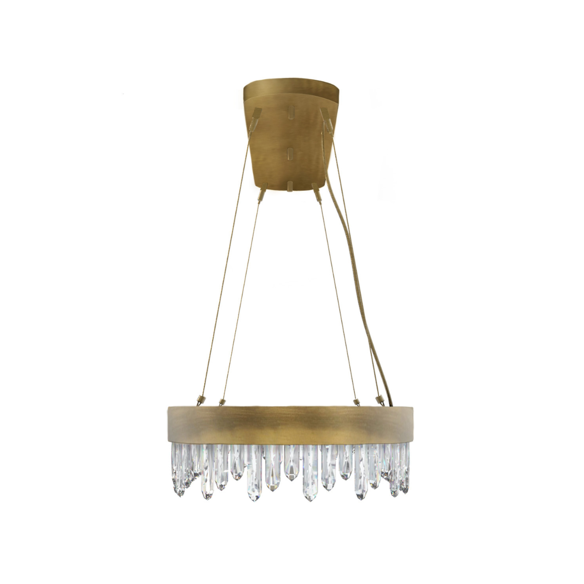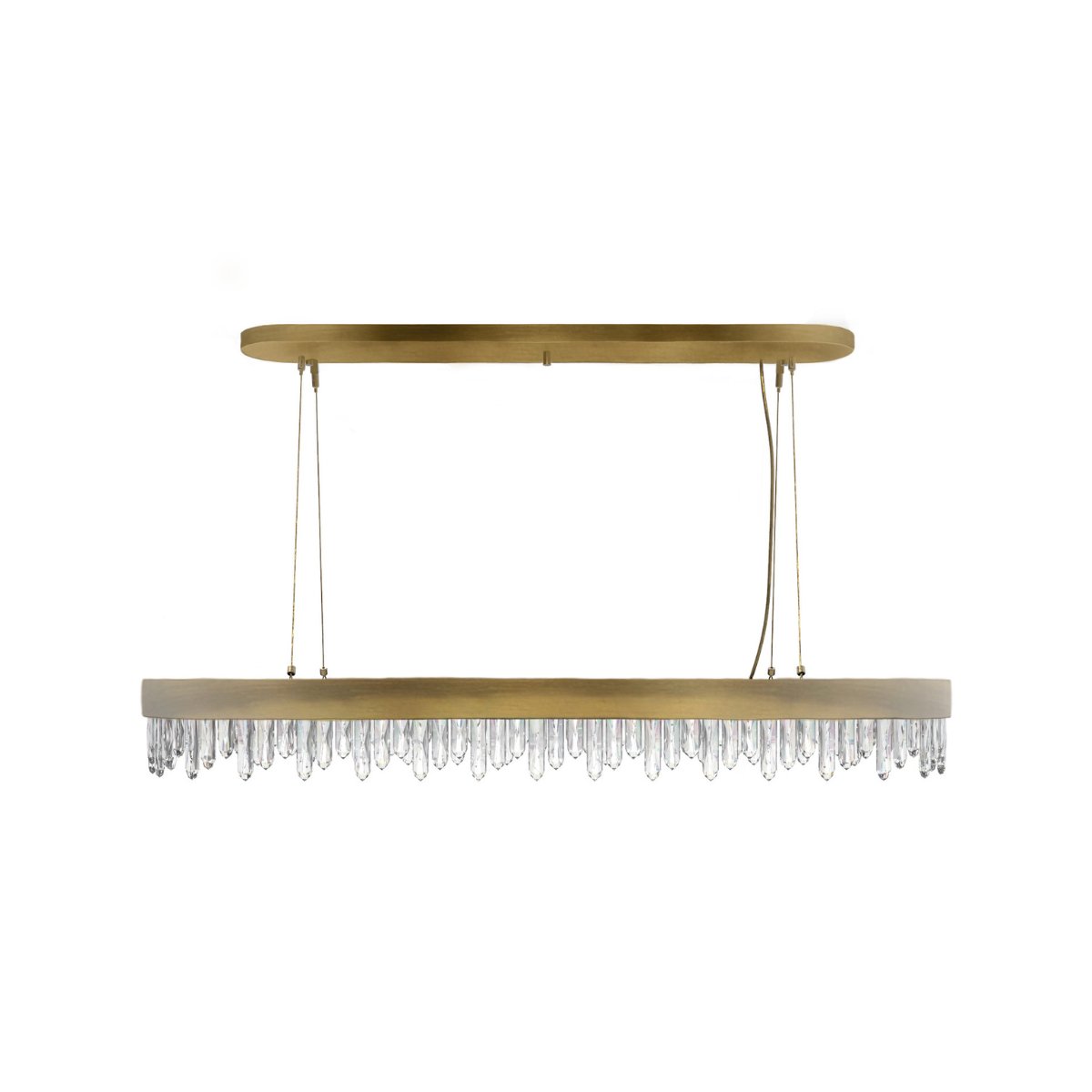 The allure of the Mexican's Giant Crystal Caves inspired the creation of the Naicca Long Suspension Lamp, an oblong chandelier that pays homage to the legend of the crystal origins. With an aged brushed brass structure and Quartz Crystal diffusers, this modern long chandelier will brighten any modern interior design, filling the room with a strong and peaceful atmosphere.