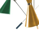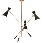 Stanley Suspension Lamp is inspired by some of the most iconic lighting designs of the 1960s. It is handmade in brass and aluminum, with a nickel plated finish on the body, and glossy black lacquer on the outer part of lampshades. The inside is lacquered a matte white. With three changeable arms, this mid-century modern lighting fixture has three counterweights all built of iron. All these features can be customized by request to include different finishes and any RAL color of your choosing. A modern light pendant that embodies all the best from the from the 50s and 60s interior design style, which looks amazing in any mid-century dining room, or a colorful kitchen.